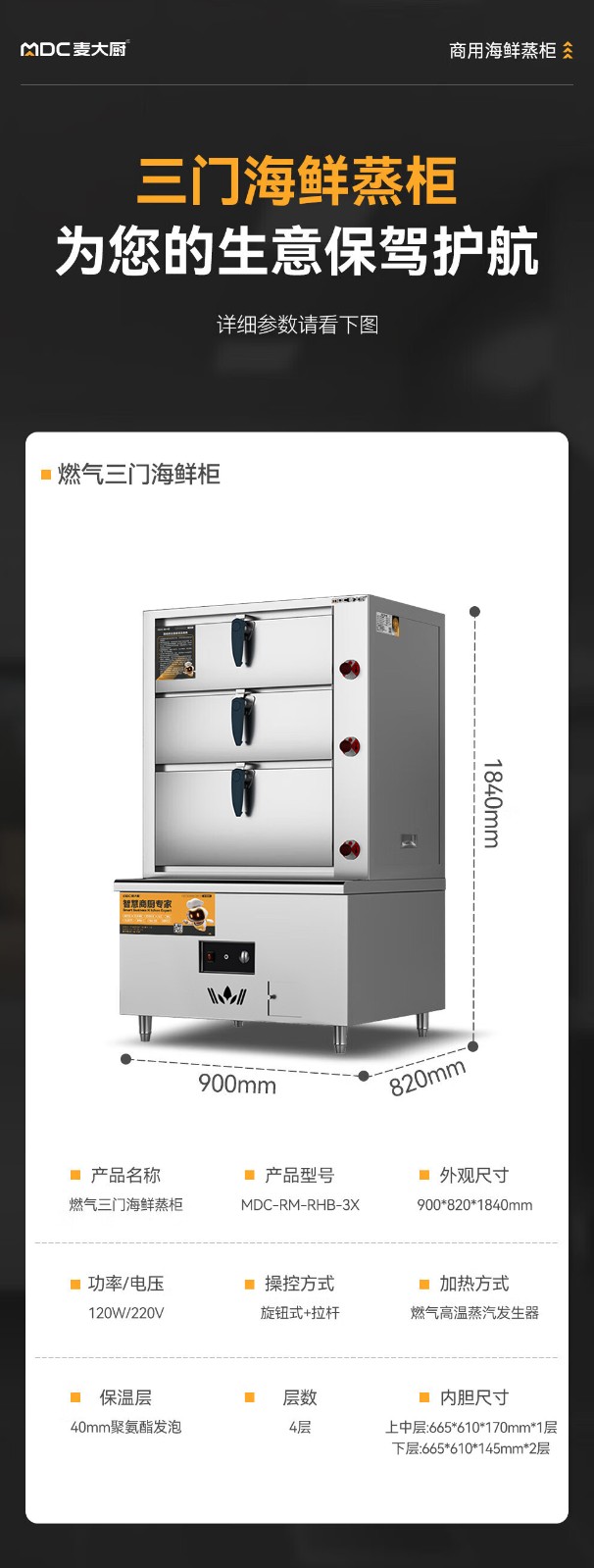 麦大厨商用蒸柜900mm燃气款三门海鲜蒸柜
