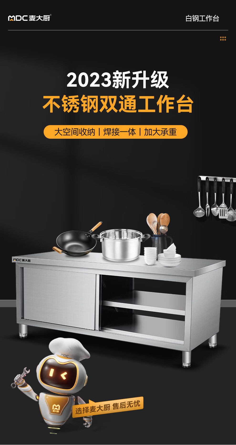 麦大厨2.0m升级款不锈钢工作台双通工作台带靠背